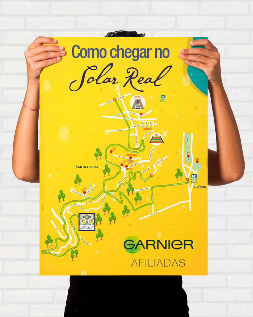 O mapa destaca a região de Santa Teresa e Glória, conectando pontos icônicos como o Solar Real, os Arcos da Lapa e o Metrô Glória. Utilizei uma paleta de cores vibrantes e tons amarelados que remetem à identidade visual solar da Garnier, trazendo um aspecto orgânico e acolhedor para as rotas.